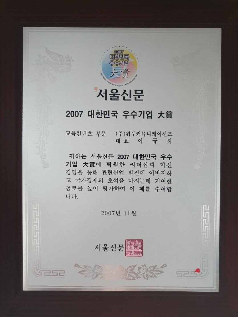 2007 대한민국 우수기업 대상 페이지 정보 작성자 WeDu 댓글 0건 조회 4,986회 작성일 19-05-30 19:31 본문 2007-11-00 대상 교육 콘텐츠 부문 2007 대한민국 우수기업 대상 서울신문 List Previous제 8회 디지털 이노베이션 대상 19.05.30