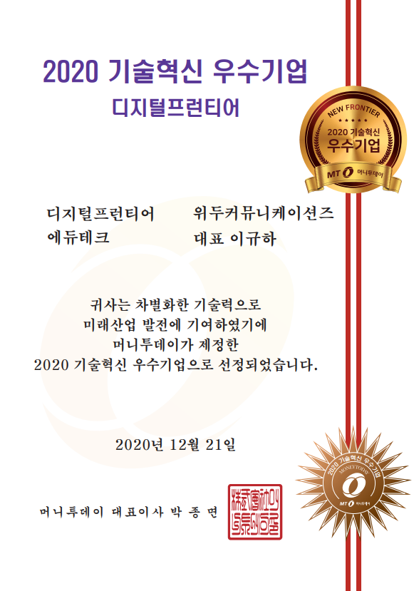 2020 기술혁신 우수기업 페이지 정보 작성자 WeDu 댓글 0건 조회 4,980회 작성일 21-12-31 12:58 본문 2020-12-21 2020 기술혁신 우수기업 디지털프런티어 에듀테크 머니투데이 대표이사 List Previous2020 소년한국 우수 어린이 도서 선정 21.12.31 Next2020 서울산업진흥원 2020 DMC어워드 21.12.31