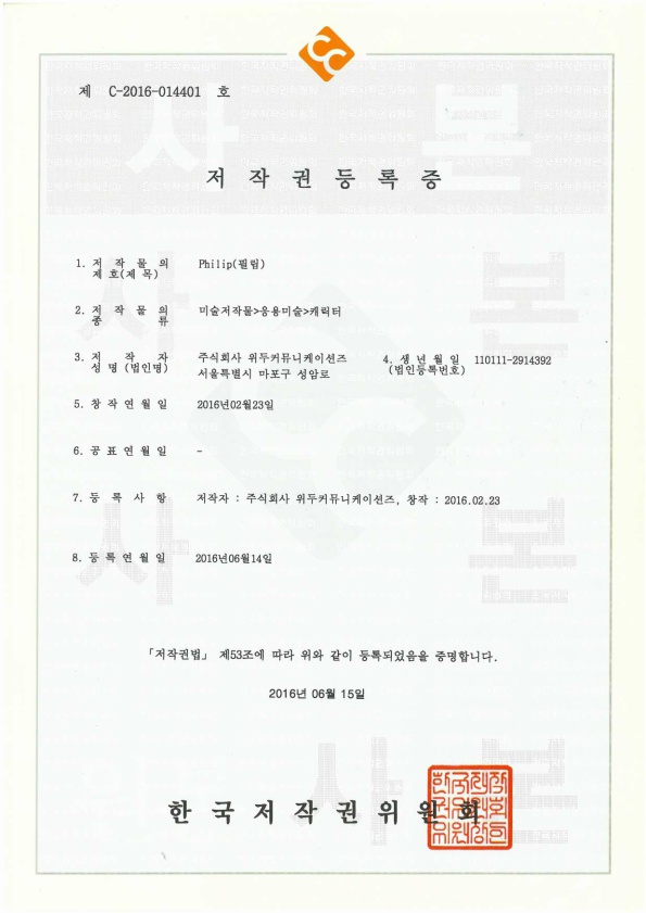 [한국/저작권] 필립 페이지 정보 작성자 WeDu 댓글 0건 조회 4,966회 작성일 19-05-30 19:09 본문 2016-06-14 저작권 C-2016-014401 필립 / 미술저작물>응용미술>캐릭터 List Previous[한국/저작권] 월터 19.05.30 Next[한국/저작권] 아리스 19.05.30