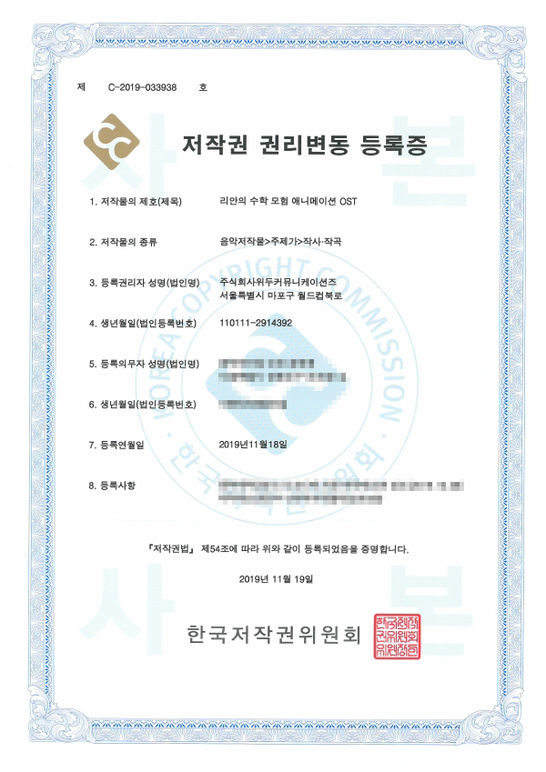 [한국/저작권] 리안의 수학 모험 애니메이션 OST 페이지 정보 작성자 WeDu 댓글 0건 조회 5,648회 작성일 19-11-25 13:54 본문 2019-11-18 저작권 C-2019-033938 음악저작물>주제가>작사·작곡 List Previous[한국/저작권] 리안의 수학 모험 여정의 시작 1,2,3,4,5 21.12.31 Next[한국/저작권] 애니메이션 리안의 수학 모험 19.11.25