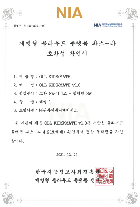 [한국/확인서] OLL KIDS/MATH 파스-타 호환성 확인서 페이지 정보 작성자 WeDu 댓글 0건 조회 8,416회 작성일 21-12-31 12:48 본문 2021-12-29 확인서 제 SC-2021-09 점검분야 : 호환 SW서비스 - 탑재형 SW List Next[한국/인증서] OLL KIDS/MATH 클라우드 서비스 확인서 21.12.31